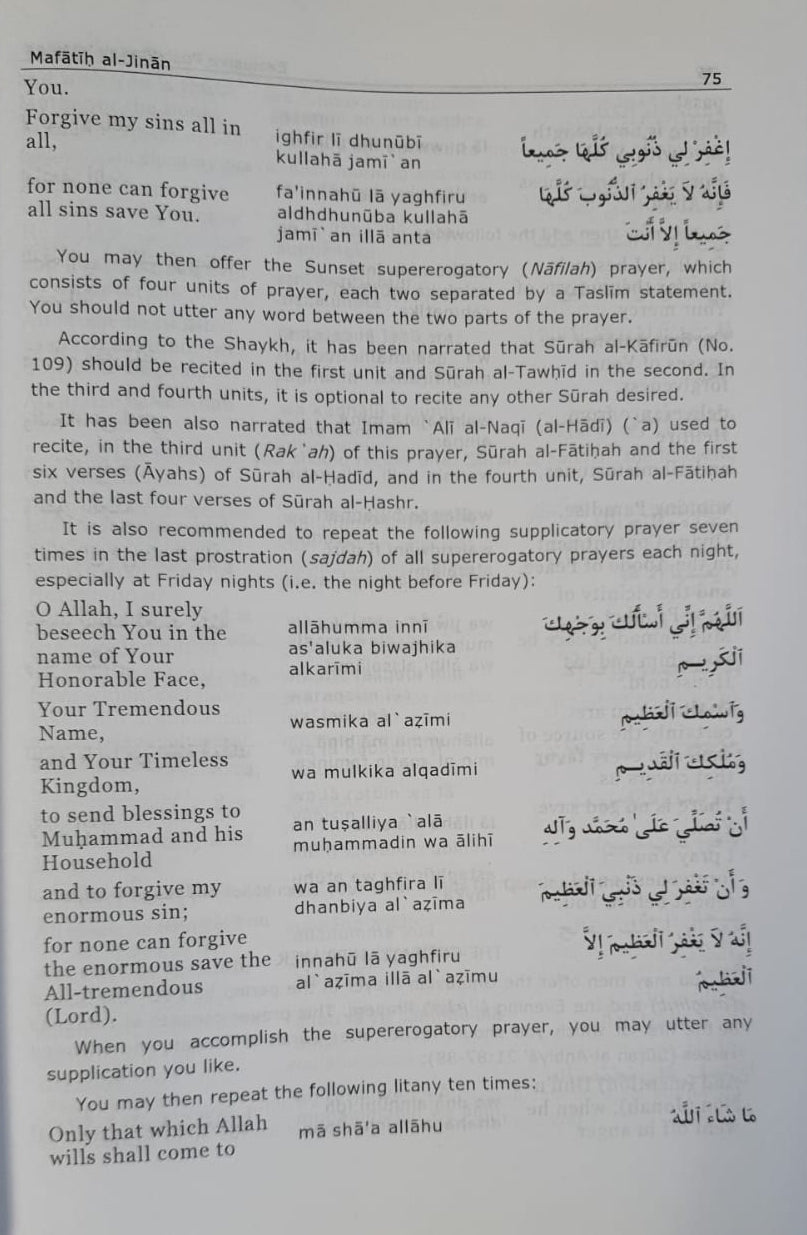 The most popular book of supplication in the Shi'a world. It contains du'as, supplications, Ziyarah texts, practices specific to certain days, months, and occasions, religious practices and manners, as well as some anecdotes narrated from the Prophet s.a.w., Imams a.s., and Islamic scholars.