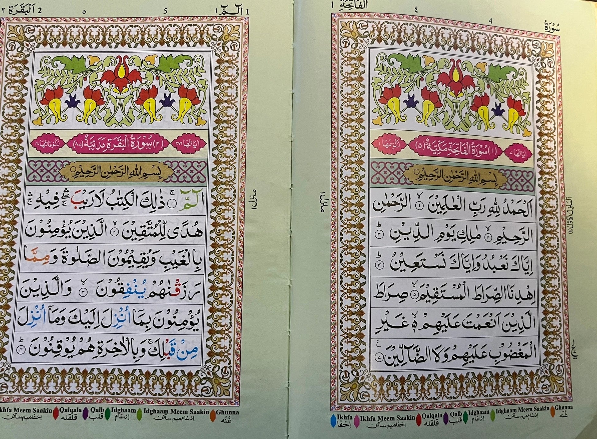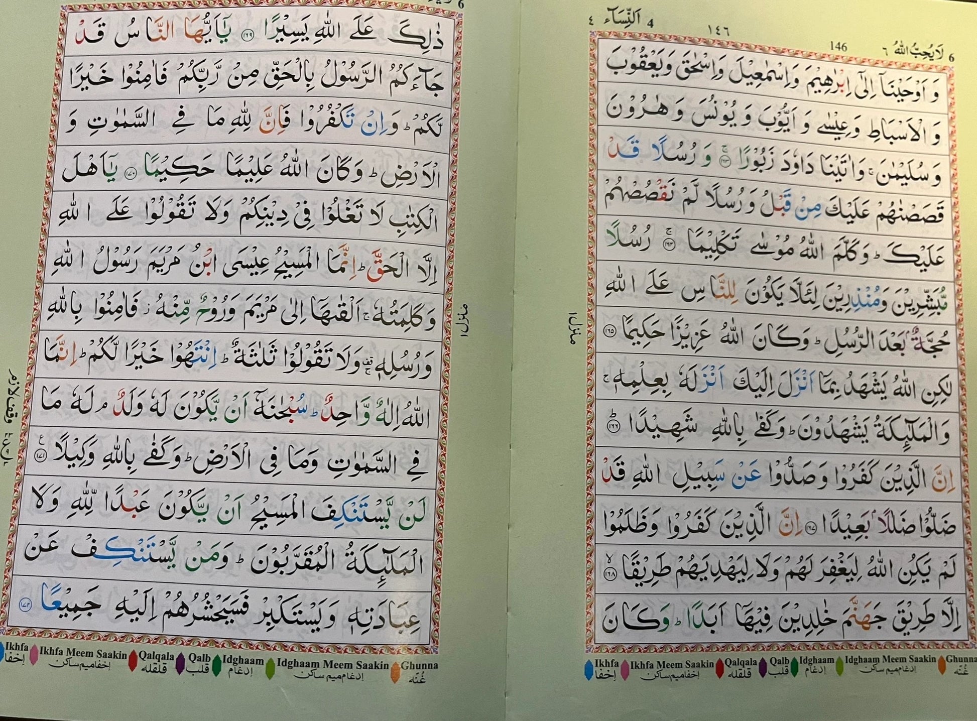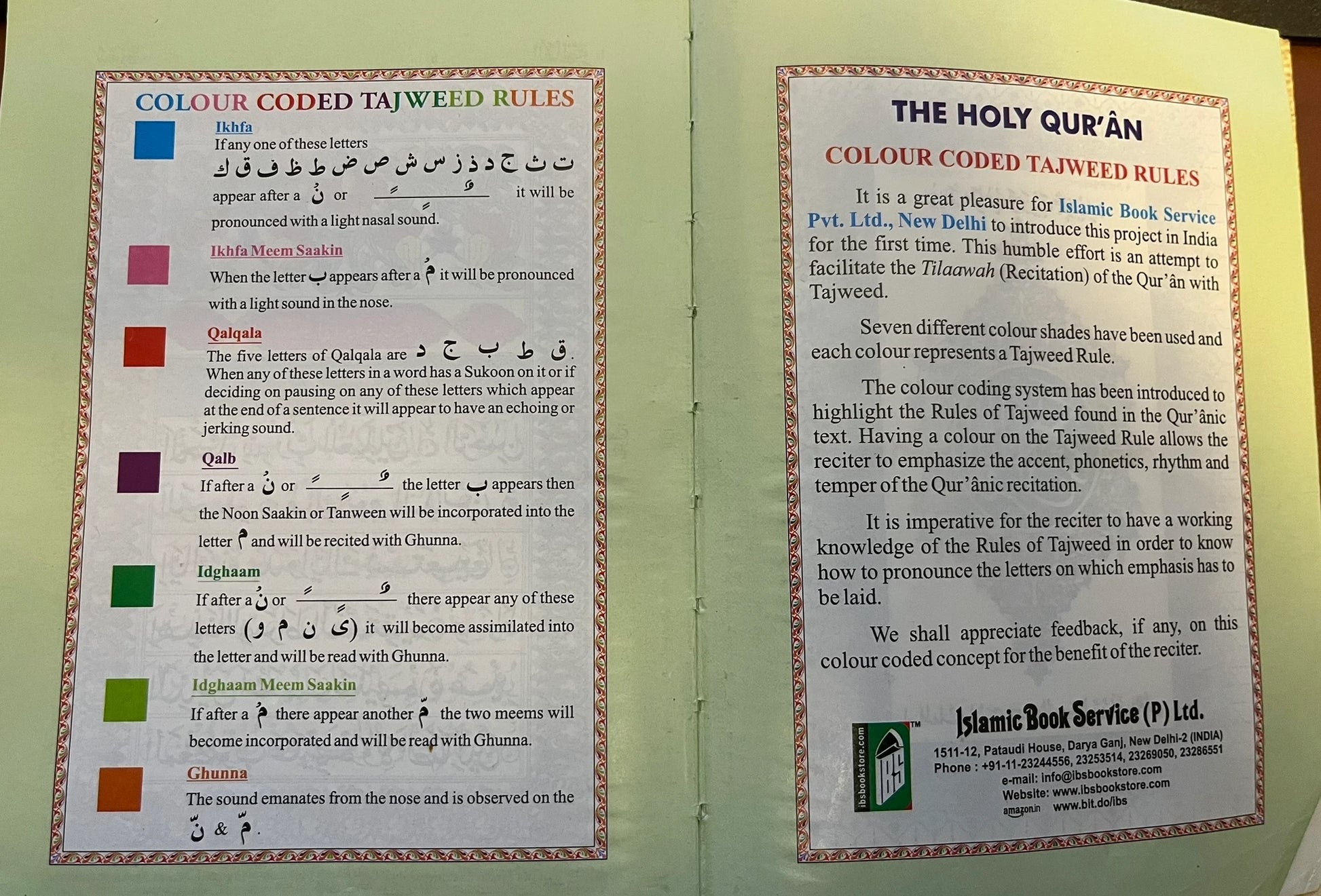 To emphasize the accent, phonetics, rhythm and temper of the Qur’anic recitation, the publishers have used different colour shades to highlight the rules of Tajweed.