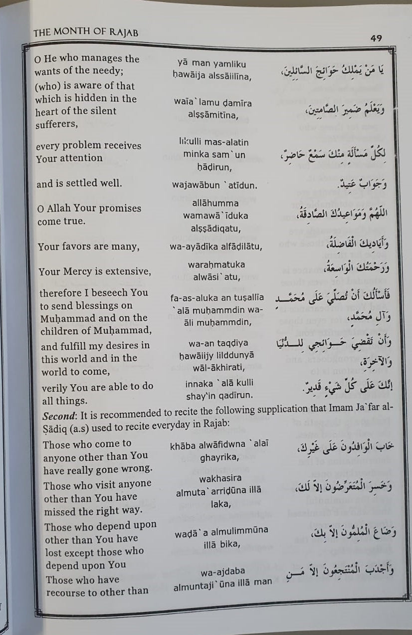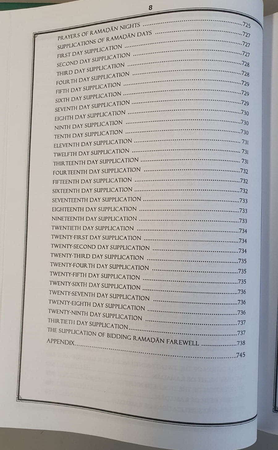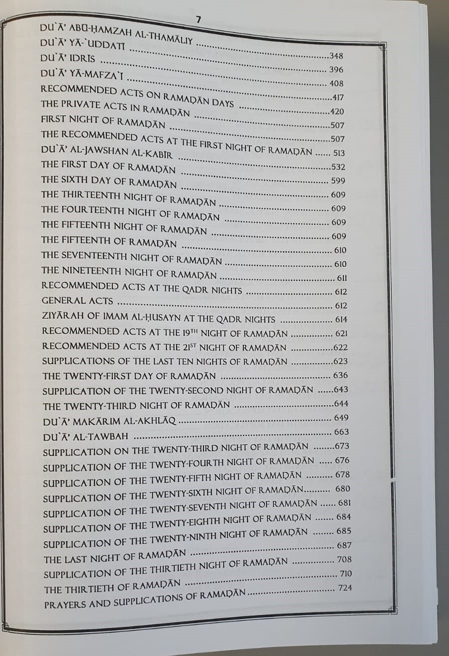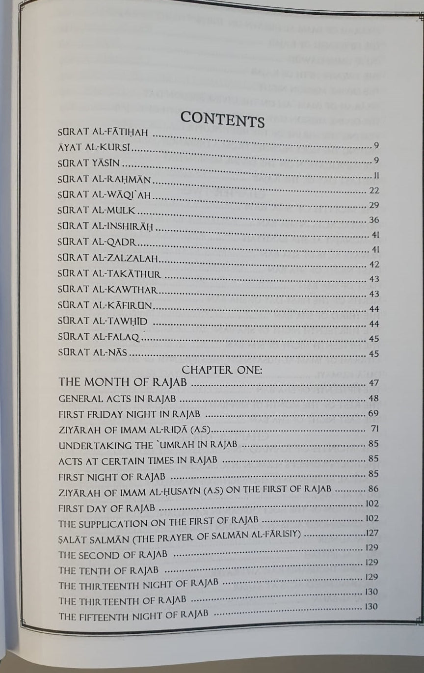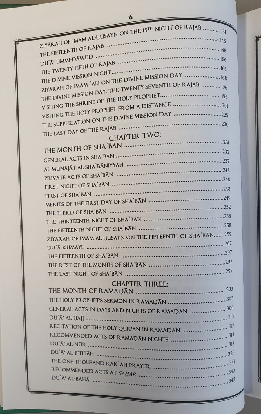 The book is comprehensive concerning the acts, supplications, prayers and Ziayarats for the 3 holy months in Islamic calendar.
