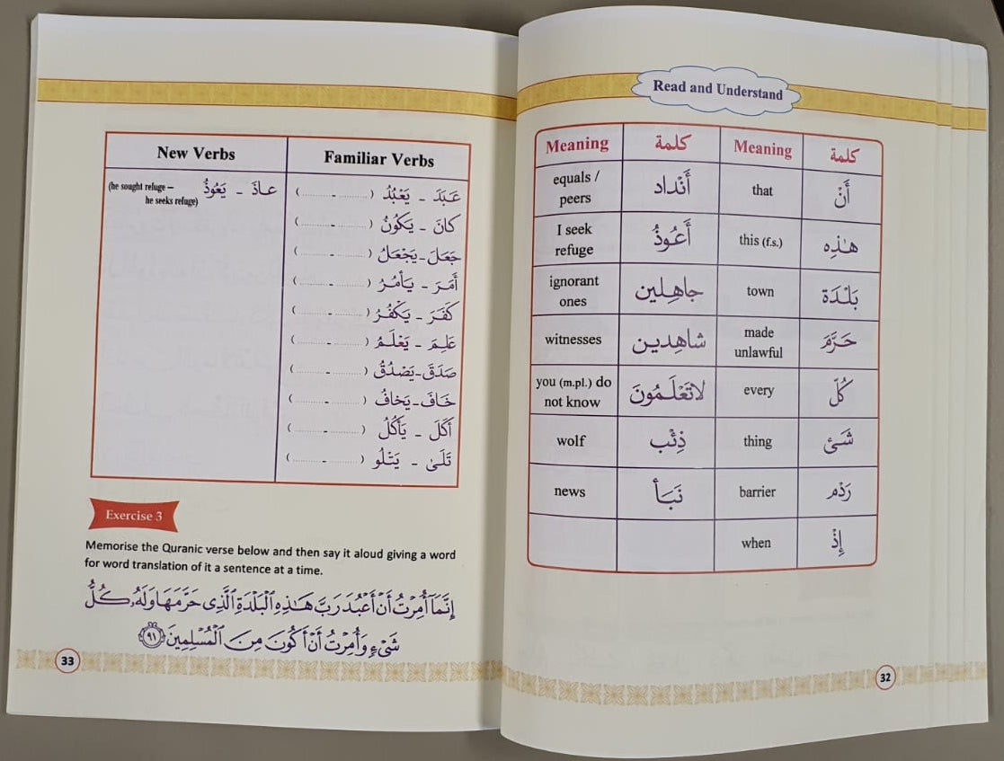Learning Arabic with the aim of understanding the Holy Quran. These set of 3 books are a first step towards realising the aspiration of those who wish to become familiar with the verses of the Quran in the shortest span of time using the simplest of techniques, whilst avoiding all the complicated grammatical rules of the language.